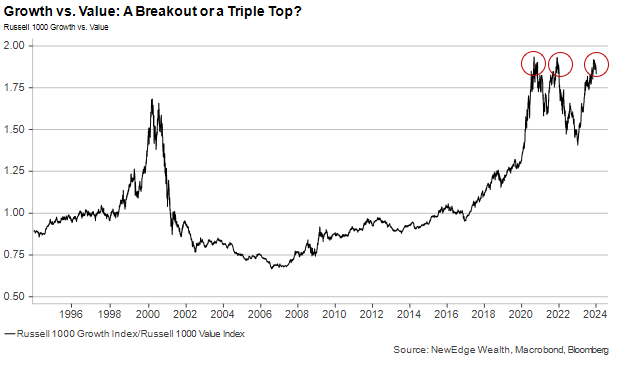 Is this Growth vs. Value ratio shaping up to form a triple top, setting up for another period where Growth underperforms Value (like early 2021 and all of 2022)?