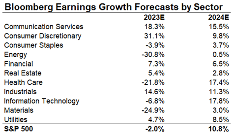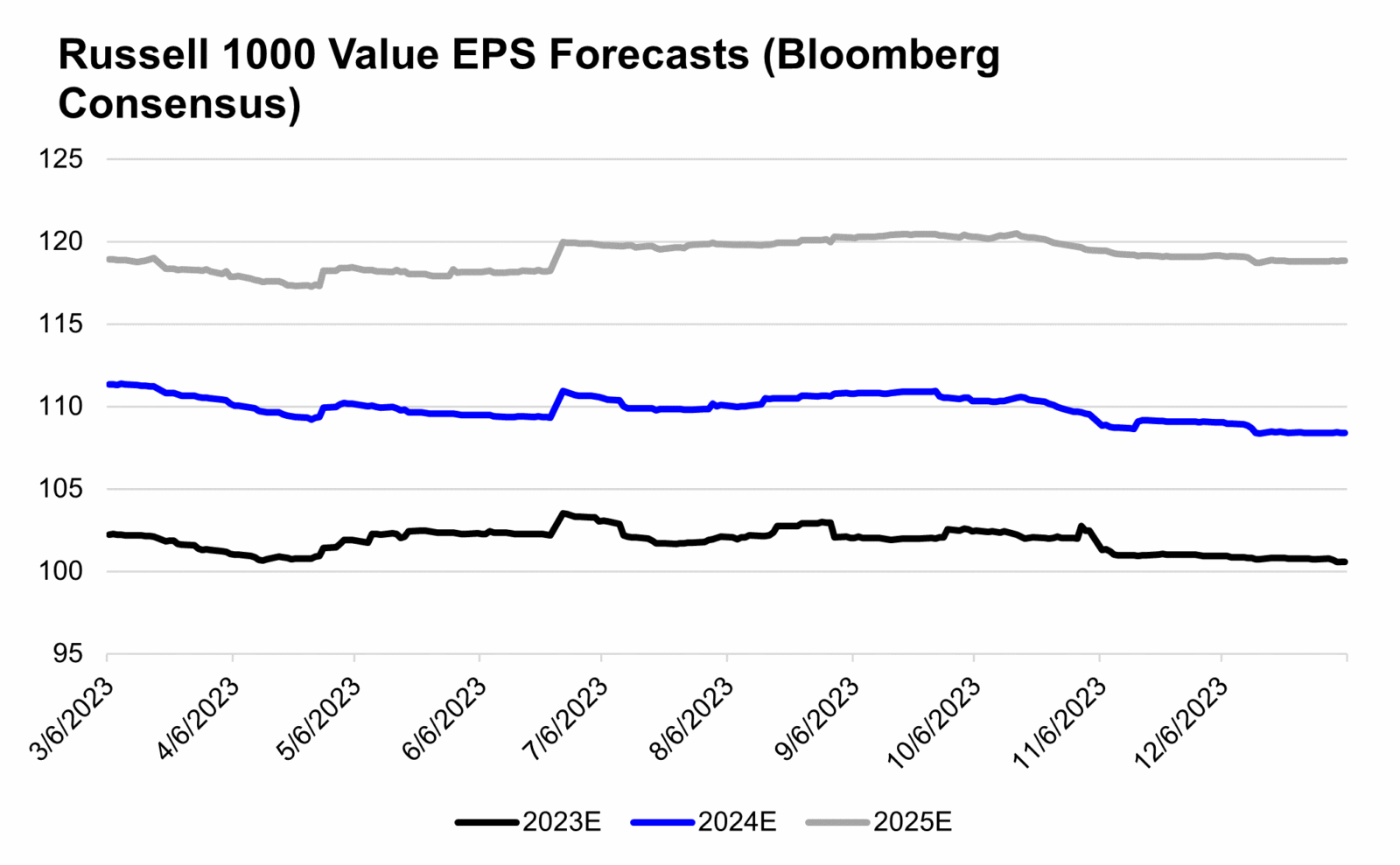 One last note on earnings revisions, the bulk of the downward revisions in 2023 for Value did come from Energy and Health Care, which are two sectors, as seen below, that are expected to return to positive EPS growth in 2024.