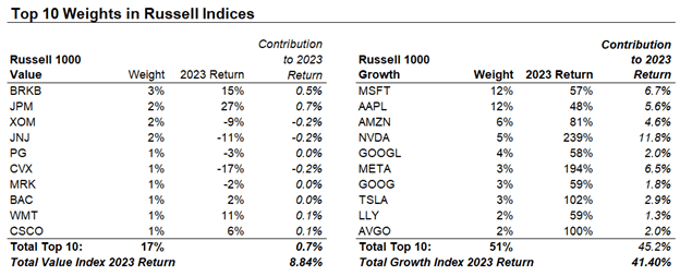 This top-heavy concentration has grown over the past year, just like with the S&P 500, given the huge outperformance of Magnificent 7 and other top 10 names. In fact, the table below shows how the top 10 names in the Growth index contributed over 100% of the index’s gains for 2023.