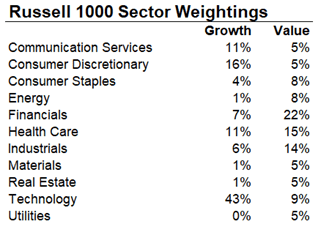 To do any analysis of Growth vs. Value, investors must appreciate how different these two indices are in their concentrations and sector exposure.