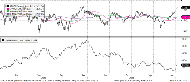 S&P 500 Health Care Sector Absolute (Top) and Relative to the S&P 500 (Bottom)