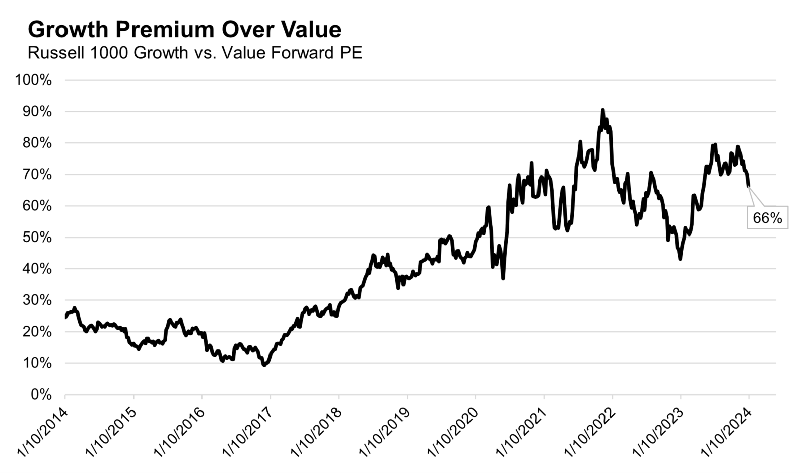 As shown in the charts below, after peaking at 77% at the end of 2023, Growth is now trading at a 66% premium to value. This is below the “blow off top” peak of 90% reached in late 2021 during the COVID policy bubble, but still well above the 10-year average of 41%. There is an argument that Growth should trade at a large premium to Value over time given the high quality nature of many growth stocks (strong cash generation, strong return on invested capital), so we think a reasonable floor for this Growth premium to Value in the near term could be ~50%.
