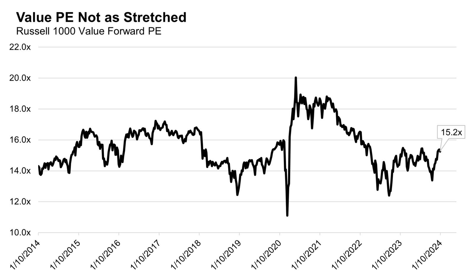 This supports investors who may be overweight Growth after its large run in 2024 to consider opportunities in Value, mostly considering the lower concentration of the Value index could provide greater opportunity for security/sector selection, with the added benefit of light positioning and reasonable valuations.