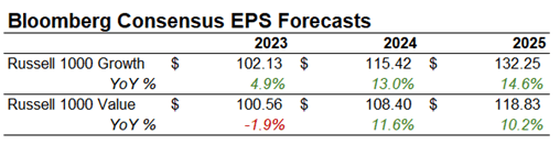 Below you can see how Growth’s EPS growth outpaced Value in 2023 and is expected by Wall Street consensus to continue to do so in 2024 and 2025.