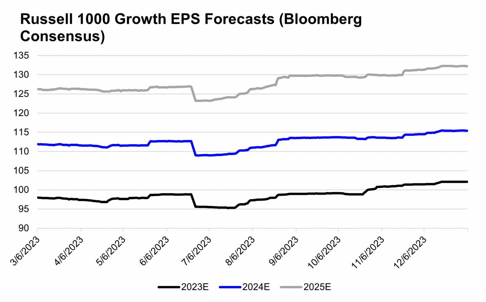 Further, over the course of 2023, earnings estimates for 2023-2025 were revised higher for Growth and lower for Value. This was an important driver of relative performance last year, as Growth’s EPS revisions higher helped to justify the soaring stock prices.