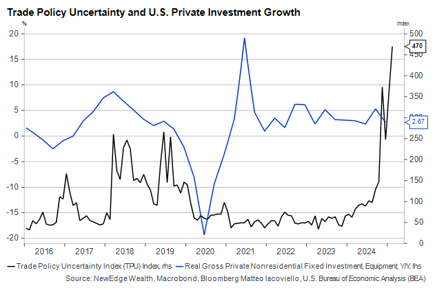 Private investment growth has been strong since the pandemic, and we continue to see announcements of large, high-profile projects related to energy and AI development. But trade policy uncertainty has a history of denting this growth, and there is more uncertainty around trade today than ever before.