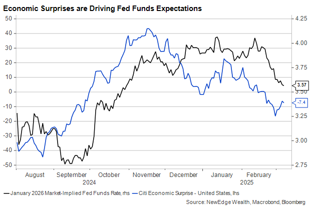 There are at least two reasons not to panic about this graph. First, the massive drop at the end of February was due to a very large increase in January’s trade deficit. Because this was driven almost entirely by firms and households avoiding future tariffs, we believe the deficit should narrow in the coming months. Second, for similar reasons, consumption may look weak in the Q1 GDP report because some demand was pulled forward into the prior quarter, when household spending growth annualized at a blistering 4.2%.