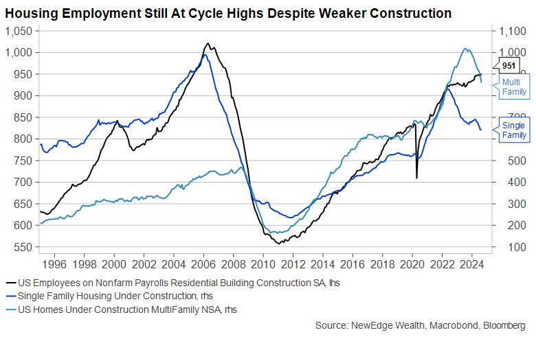 One important item to flag is if housing activity does pick up given lower rates, causing housing construction to pick up again, housing-related employment is still notably tight. This suggests that there is little slack in the housing-related labor market if activity were to pick up materially, of course, an odd, or Strange, backdrop for the Fed to embark on its largest non-recessionary easing cycle on record.