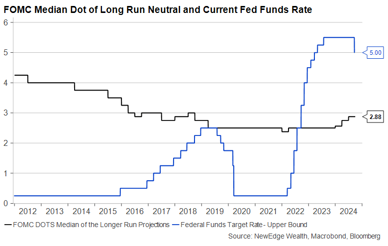 The Fed has long talked about the neutral rate in its policy meetings, a very Greenspanian pursuit, but it is important to appreciate that this is the first cutting cycle that the Fed is explicitly targeting a return to a forecasted “neutral” rate, an estimate of which they have been forecasting only since 2012 (at an adorable initial level of 4.25%, which was subsequently cut to 2.5% over the course of the following “secular stagnation” decade).