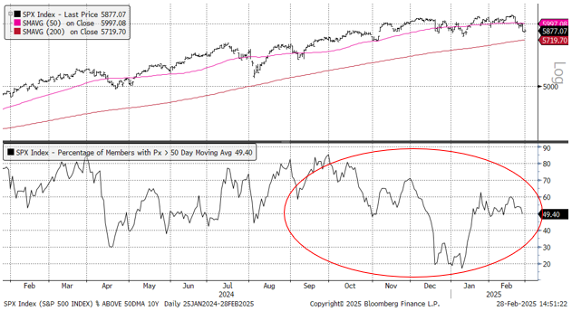 Further, we have been observing deteriorations in market momentum (weekly Moving Average Convergence Divergence (MACD) shown below) and breadth (% of names trading above their 50-day moving averages shown below). These factors are not death knells to rallies, but they suggest that a shift away from the powerful, low volatility, “up and to the right” rallies of 2023-2024 is possible. This is not to say a bear market like 2022 is imminent, but that a sideways year like 2015 and 2018 (which both included moments of incredible long-term buying opportunities) is a potential outcome for 2025.