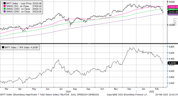 Bloomberg Magnificent 7 Index Absolute (Top) and Relative to the S&P 500 (Bottom)