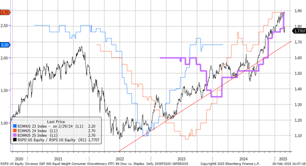 Interestingly, analysts are continuing to raise their growth estimates, mainly for household consumption, despite the recent string of weaker data. The highlighted purple line in the chart below shows how household consumption forecasts have been raised YTD, despite the ratio of equal weight Consumer Discretionary vs. Staples (a potentially helpful leading indicator of consumption forecast revisions) starting to weaken. This remains a must-watch ratio for how the equity market is judging the health of the US consumer.
