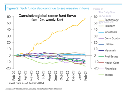 For those hoping (ourselves included) that Health Care’s weak 2023 performance, sector outflows, and flip to positive EPS growth in 2024 could set up for better relative performance this year may have to be patient given these weakening relative performance trends. This weaker relative performance appears to be confirmed by 2024 EPS growth revisions for the sector, which have gone from 17% to start the year to 13.8% today.