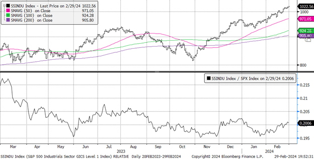 S&P 500 Industrial Sector Absolute (Top) and Relative to the S&P 500 (bottom)