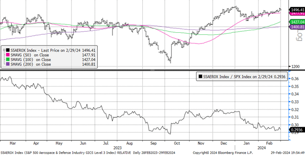 This outperformance has been dulled by lagging performance in the Aerospace & Defense industry group, dragged down by Boeing’s woes and weak relative performance out of the large defense contractors.
