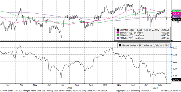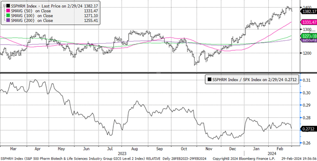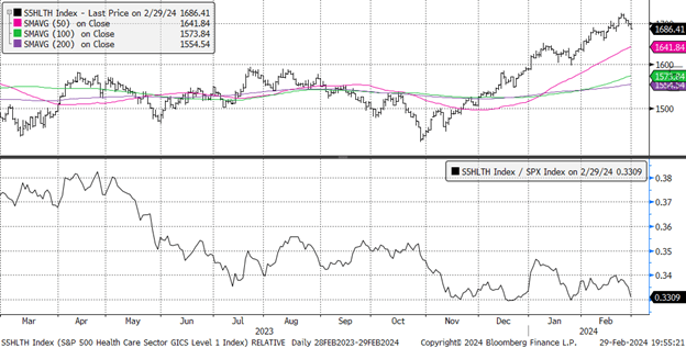 Health Care exhibited strong absolute performance to start 2024, but late this week began to lose momentum. This has led to an end to Health Care’s nascent relative performance recovery, as the relative performance chart below has turned lower.