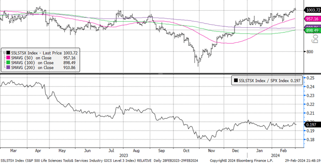 S&P 500 Life Sciences & Tools Industry Absolute (Top) and Relative to the S&P 500 (bottom)