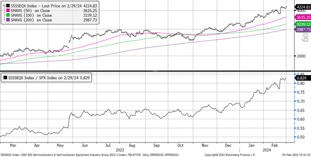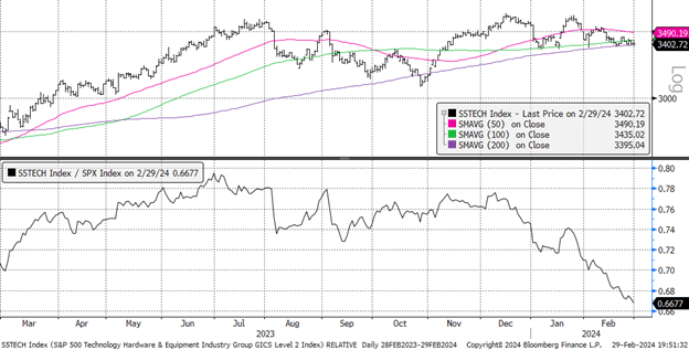 There is nuance to this outperformance, with the strength driven by the Semiconductor and Software industry groups, while the Hardware industry group is lagging significantly. Each of these industry groups has their “mega” drivers of performance: Semi strength boosted by Nvidia (NVDA), Software strength boosted by Microsoft (MSFT), and Hardware relative weakness dragged down by Apple (AAPL).