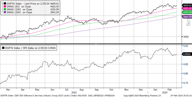 S&P 500 Software Industry Absolute (Top) and Relative to the S&P 500 (bottom)