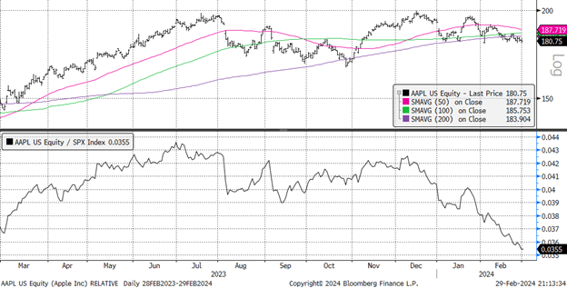 AAPL (Top) and Relative to the S&P 500 (bottom)