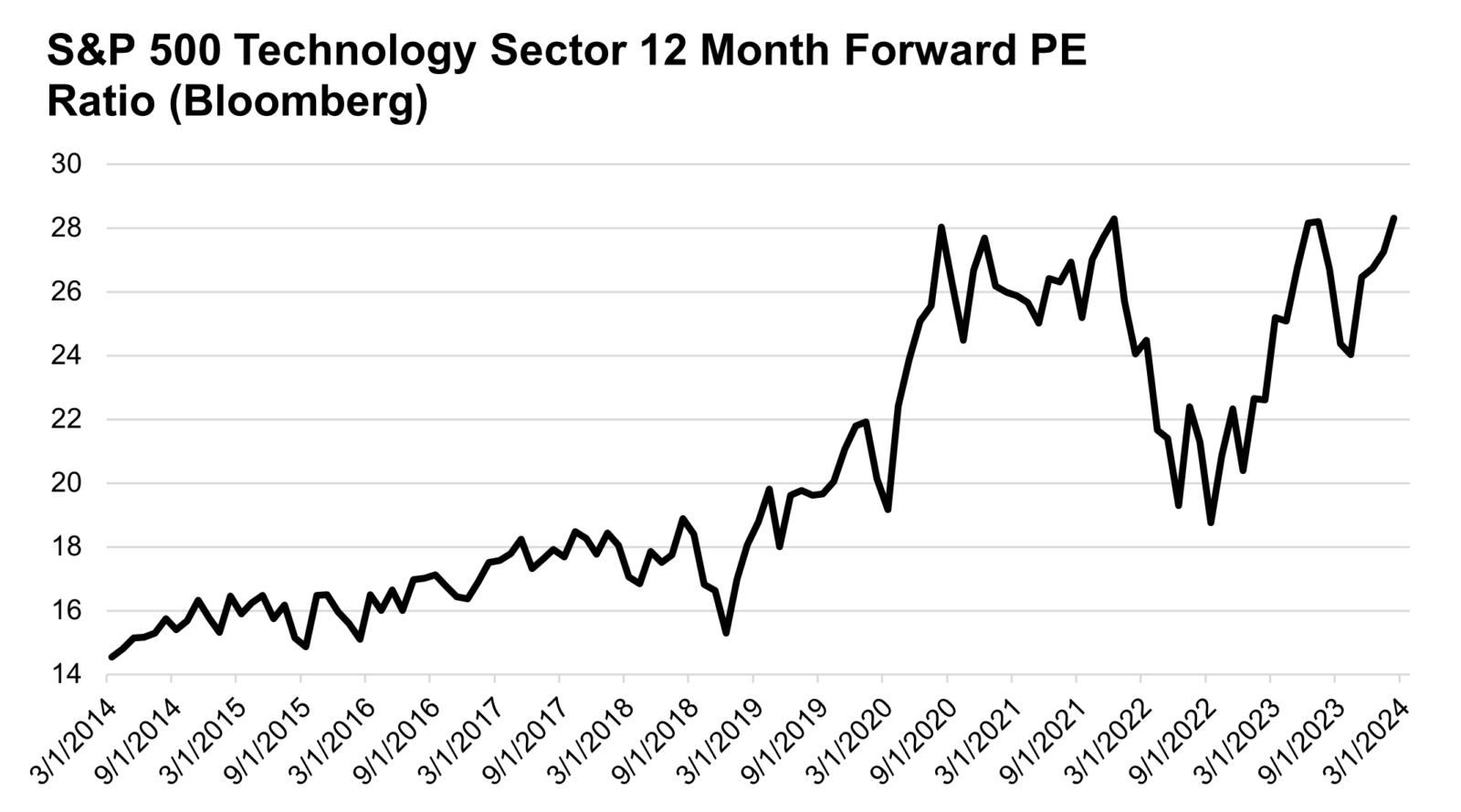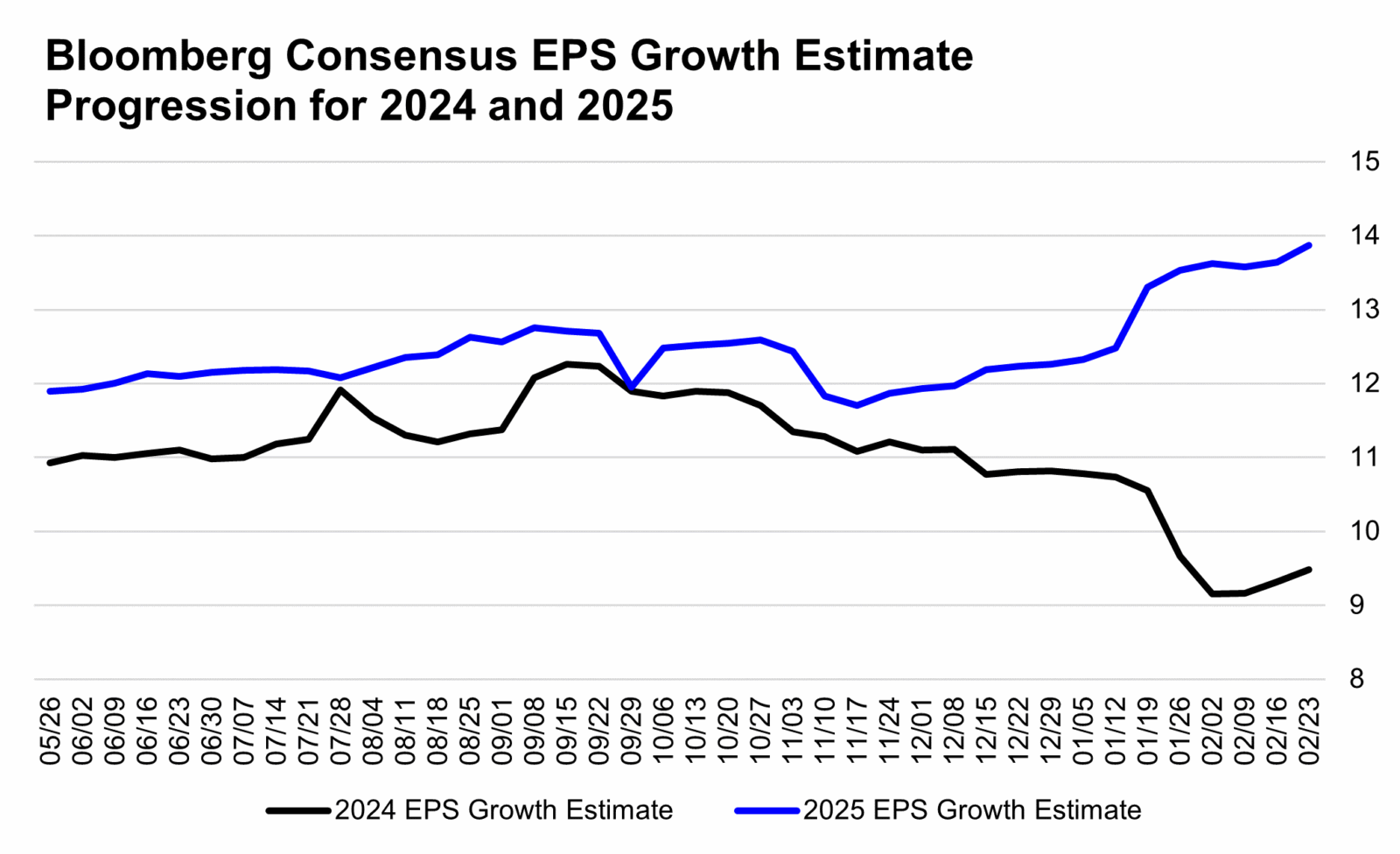- More back-end loaded forecasts: overall 2025 EPS estimates have remained fairly static, but analysts have cut 2024 growth forecasts and raised 2025 growth forecasts. This creates a more “back-end loaded” forecasts looking out two years, which increases the uncertainty of fulfilling these estimated growth rates.
