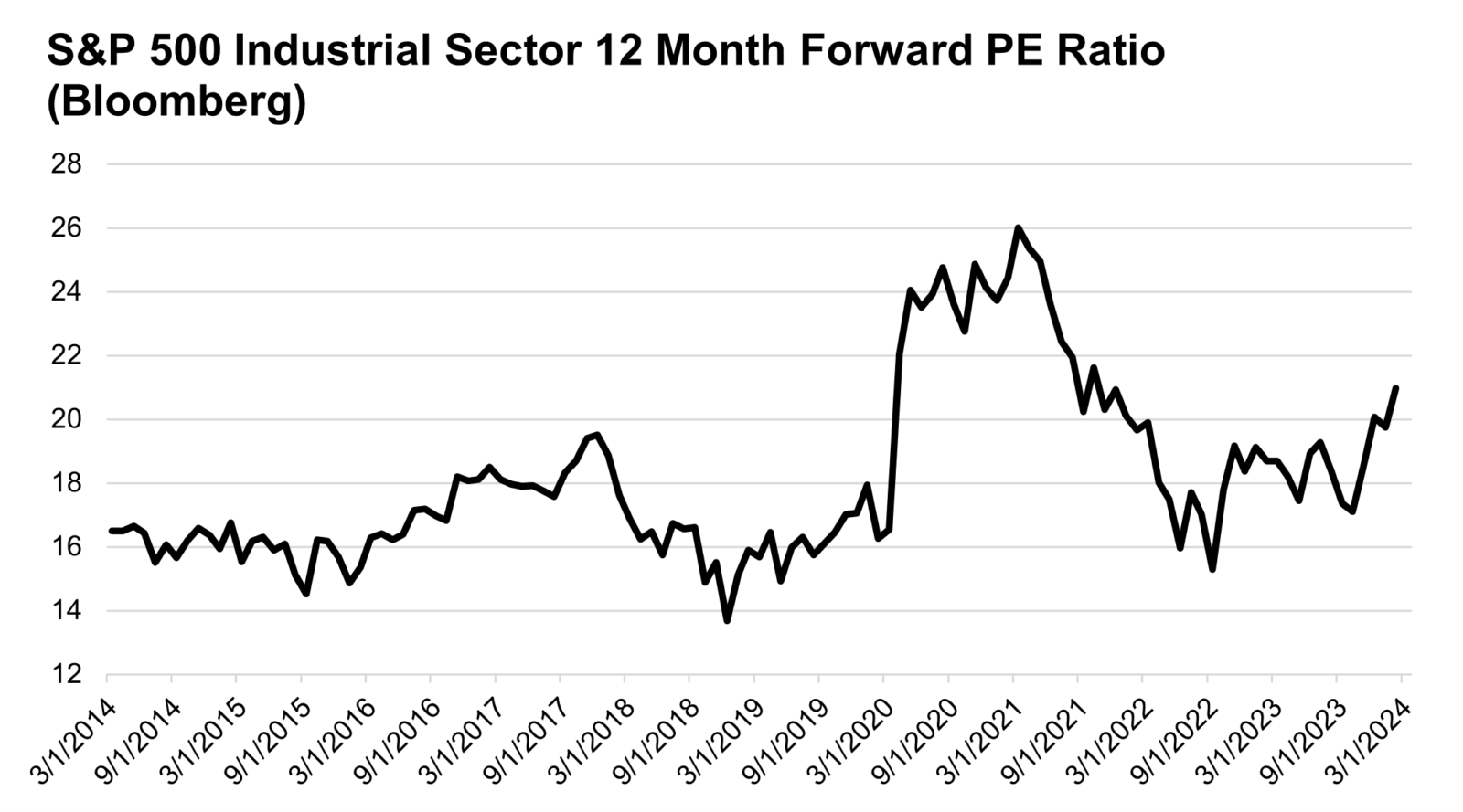 Overall, the biggest challenge for the Industrial sector could be forward valuations, which are very stretched versus history (note the high valuations during 2020/2021 were due to a collapse in earnings and the boost from ultra-easy monetary policy, meaning we do not think these valuations can be used as a reasonable baseline for sustainable future valuations). However, just like for the market, valuation is not a helpful timing tool, meaning optimism around fiscal stimulus, the technology infrastructure build-out, and a nascent cyclical recovery could keep these (typically mean-reverting) valuations elevated.