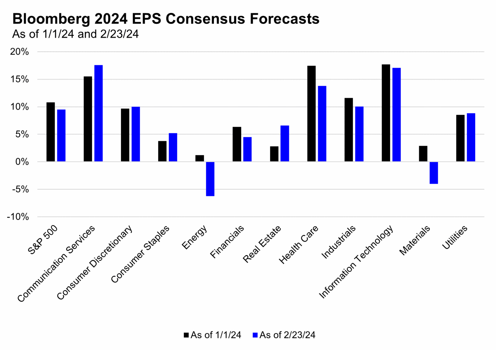 For those hoping (ourselves included) that Health Care’s weak 2023 performance, sector outflows, and flip to positive EPS growth in 2024 could set up for better relative performance this year may have to be patient given these weakening relative performance trends. This weaker relative performance appears to be confirmed by 2024 EPS growth revisions for the sector, which have gone from 17% to start the year to 13.8% today.