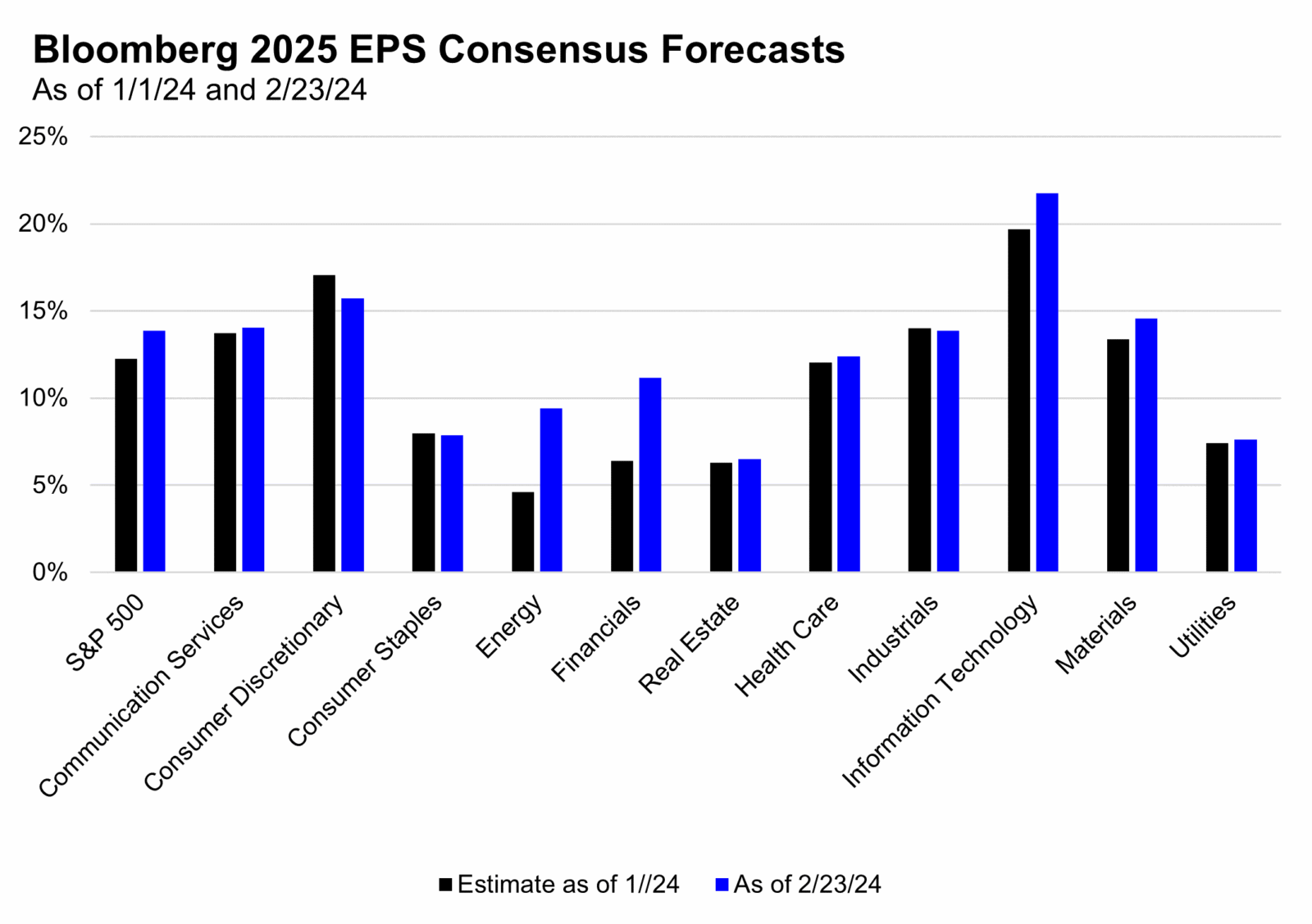 - 2025 Estimates Revisions Broadly Higher: The 2025 estimate revisions higher have been driven primarily by Technology, Energy and Financials, while Consumer Discretionary is the one sector to see estimate cuts.