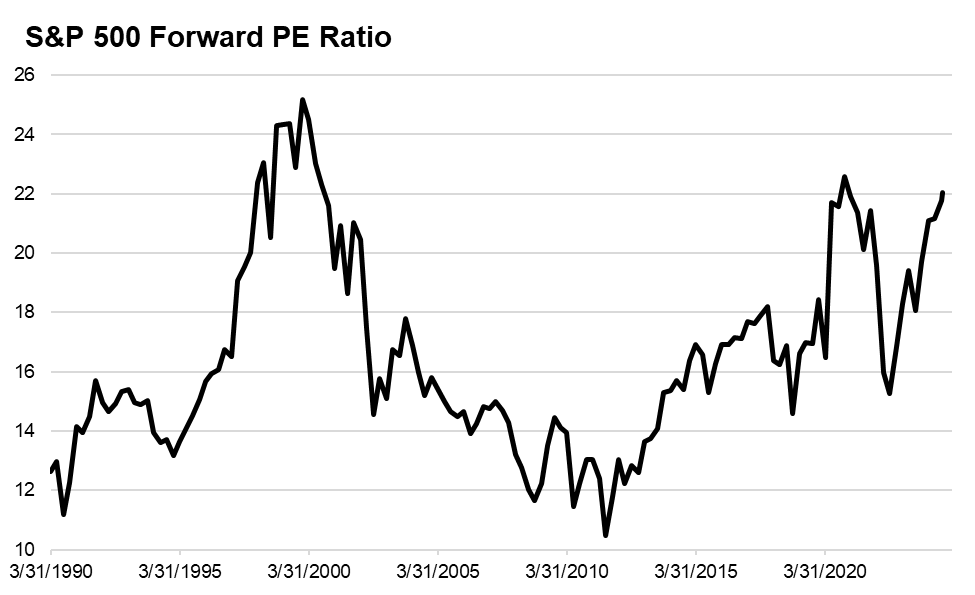 This move higher in valuations has returned the S&P 500 to 22x forward earnings, a level that has only been surpassed two times in modern history: at the height of the late-1990s/2000s tech bubble and at the 2020 COVID peak when markets were being flooded with liquidity and earnings were depressed.
