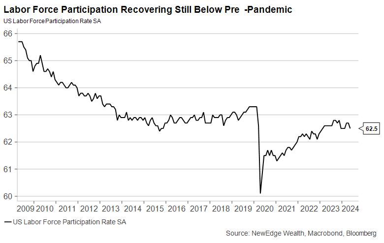 • The Unemployment rate ticking higher to 4.0% despite a drop in Labor Force Participation, reflecting the weak Household Survey, on which the unemployment calculation is based.