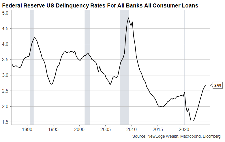 This reflects how consumers in upper- and lower-income cohorts are also “going their own way”, with lower income consumers feeling the pinch of sticky prices and depleted excess savings (notably we have seen delinquency rates for credit cards spike higher, likely reflecting this lower income stress).