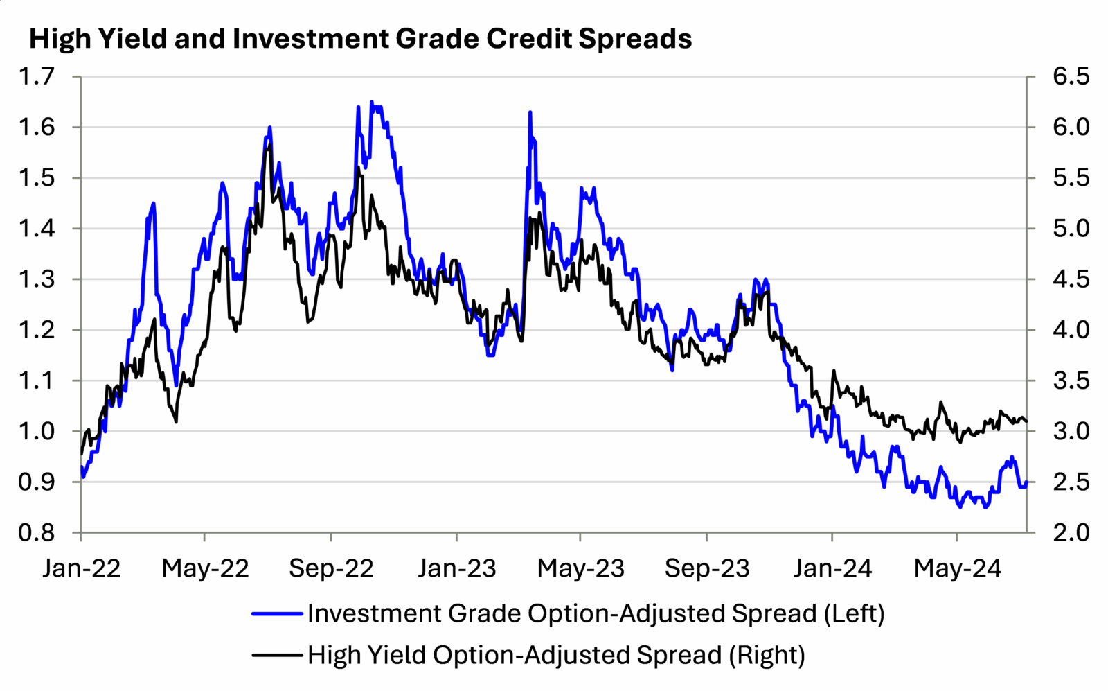 Spreads across the credit spectrum are highly correlated, meaning spreads typically widen or contract for all cohorts of credit together, but spreads on High Yield bonds are consistently wider and more volatile than Investment Grade. This is because companies that issue this “junk” debt are likelier to encounter refinancing difficulties and have higher default risk in slower growth environments.