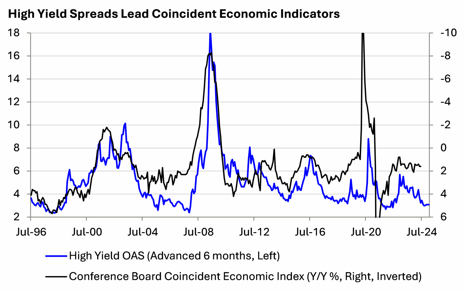 Index Information: All returns represent total return for stated period. The BBB IG Spread is the Bloomberg Baa Corporate Index that measures the spread of BBB/Baa U.S. corporate bond yields over Treasuries. The HY OAS is the High Yield Option Adjusted Spread index measuring the spread of high yield bonds over Treasuries. The Conference Board’s Coincident Economic Index (CEI) is a monthly composite estimate of current economic performance in the U.S. The Index is made up of components that reflect employment, household income, industrial output, and business revenue. The Bloomberg US Corporate High Yield Bond Index measures the USD-denominated, high yield, fixed-rate corporate bond market.