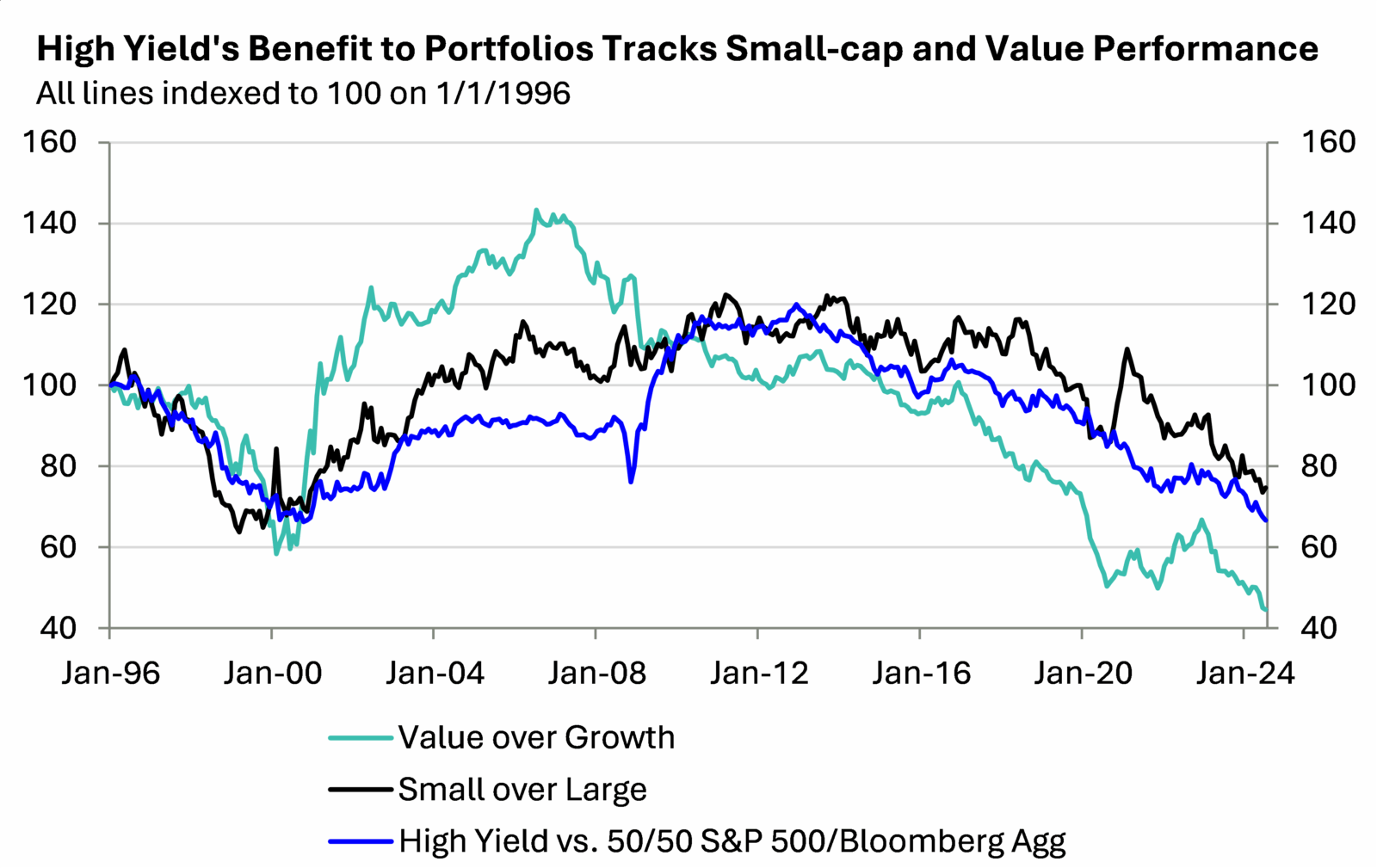 However, it is important to note that High Yield tends to add the most value to diversified portfolio returns when the economy is recovering from a downturn and is heating up, compared to today’s backdrop of slowing late-cycle growth. This early cycle “need for speed” dynamic explains their tight fit with the relative performance of small-cap and value stocks, which also tend to perform better early in an economic recovery.