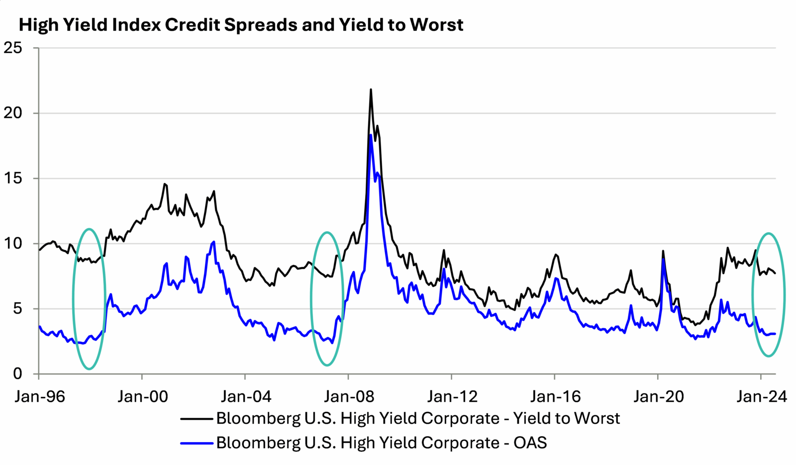 Bonds compensate investors for both credit risk and interest rate risk, though the mix fluctuates depending on the sector and the environment. Currently, High Yield investors are being rewarded handsomely for interest rate risk – as they are for holding pretty much all longer duration bonds – but not as generously for credit risk. The green circles highlighting the gaps between the blue and black lines on the graph above show this well.
