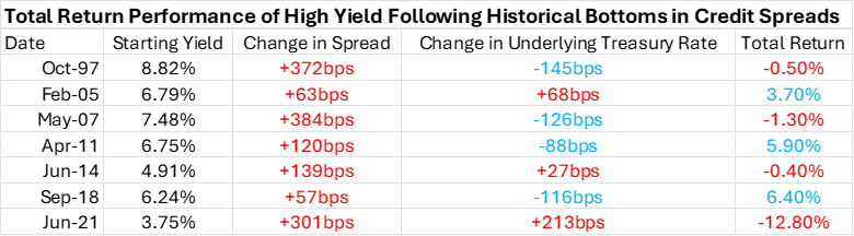 The bulk of High Yield’s 7.9% coupon comes from the high level of underlying interest rates, while current credit spreads are unusually tight and likely to widen further from here. For a look at how High Yield would perform in that scenario, we need only look at history: