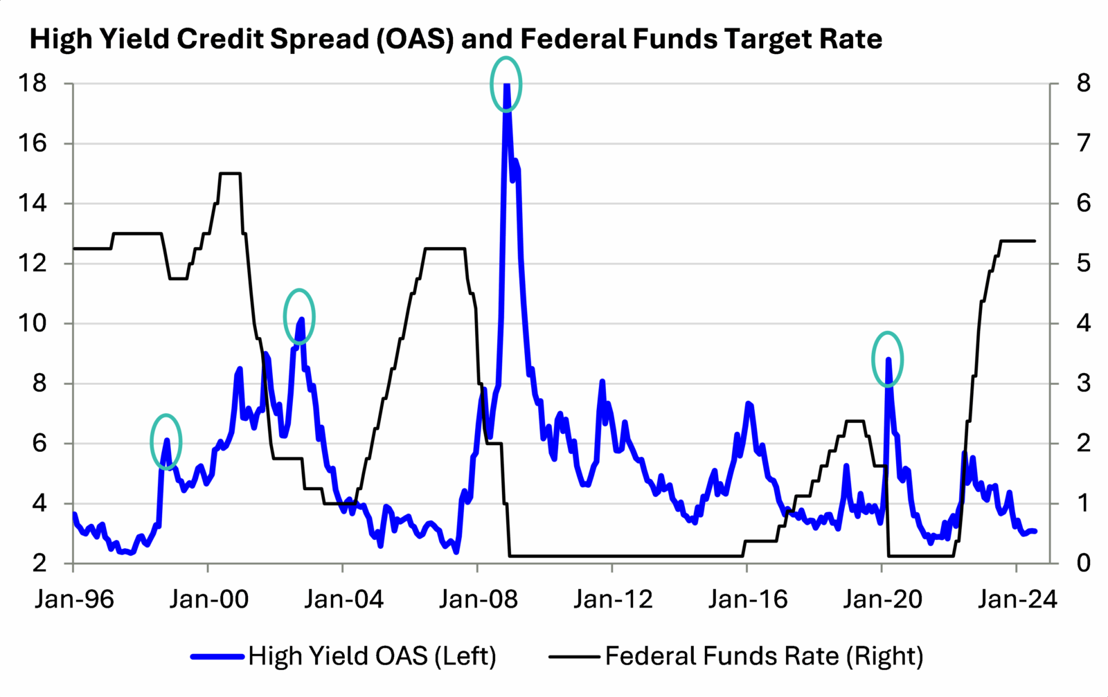 The 2010s were marked by very low yields and mostly tight spreads outside of a few stressful periods, but High Yield generally performed well during the low and slow recovery from the 2008 crises. The late 1990s and mid-2000s provide a more apt comparison to today. In both periods, the Fed had finished hiking rates and was preparing to cut them, and economic growth had softened or was just about to.