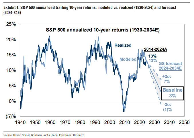 But this doesn’t mean we should simply write off these predictions of lower forward returns. We happen to agree with Goldman and the likes of Stifel’s Barry Bannister, who has been writing about lower long-term returns throughout 2024, that there is risk that returns over the next decade will be lower than the prior decade.