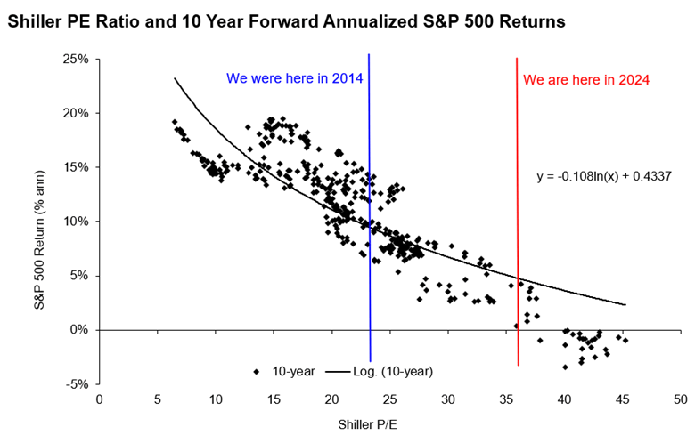 The chart below shows the difference in these starting points in 2014 vs. 2024 from a valuation perspective, using the Shiller Cyclically Adjusted Price to Earnings Ratio (CAPE) and the 10 year forward annualized returns from the S&P 500. It is undeniable that the starting point of today’s valuations have historically been accompanied by periods of lower forward returns, while 2014’s starting point of valuations is consistent with the returns that we have experienced over the last decade.