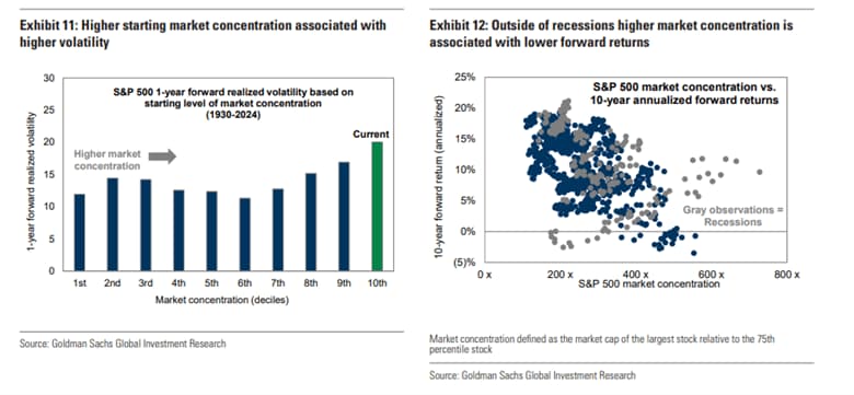 One important point that Goldman included in its recent report was on index concentration and how high degrees of concentration, like in today’s market, have been associated with both higher volatility and lower forward returns, as shown in the figure from the report below.