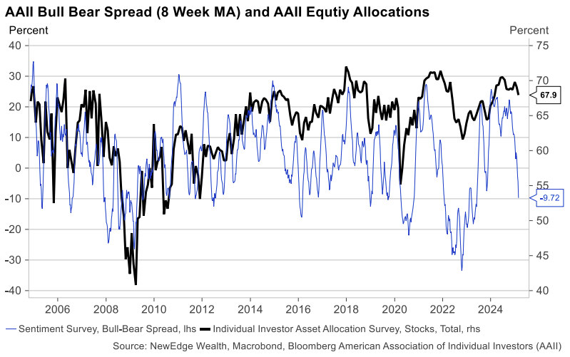 - Investor sentiment has fallen off a cliff in the first quarter of 2025, but equity positioning remains very bullish through March.