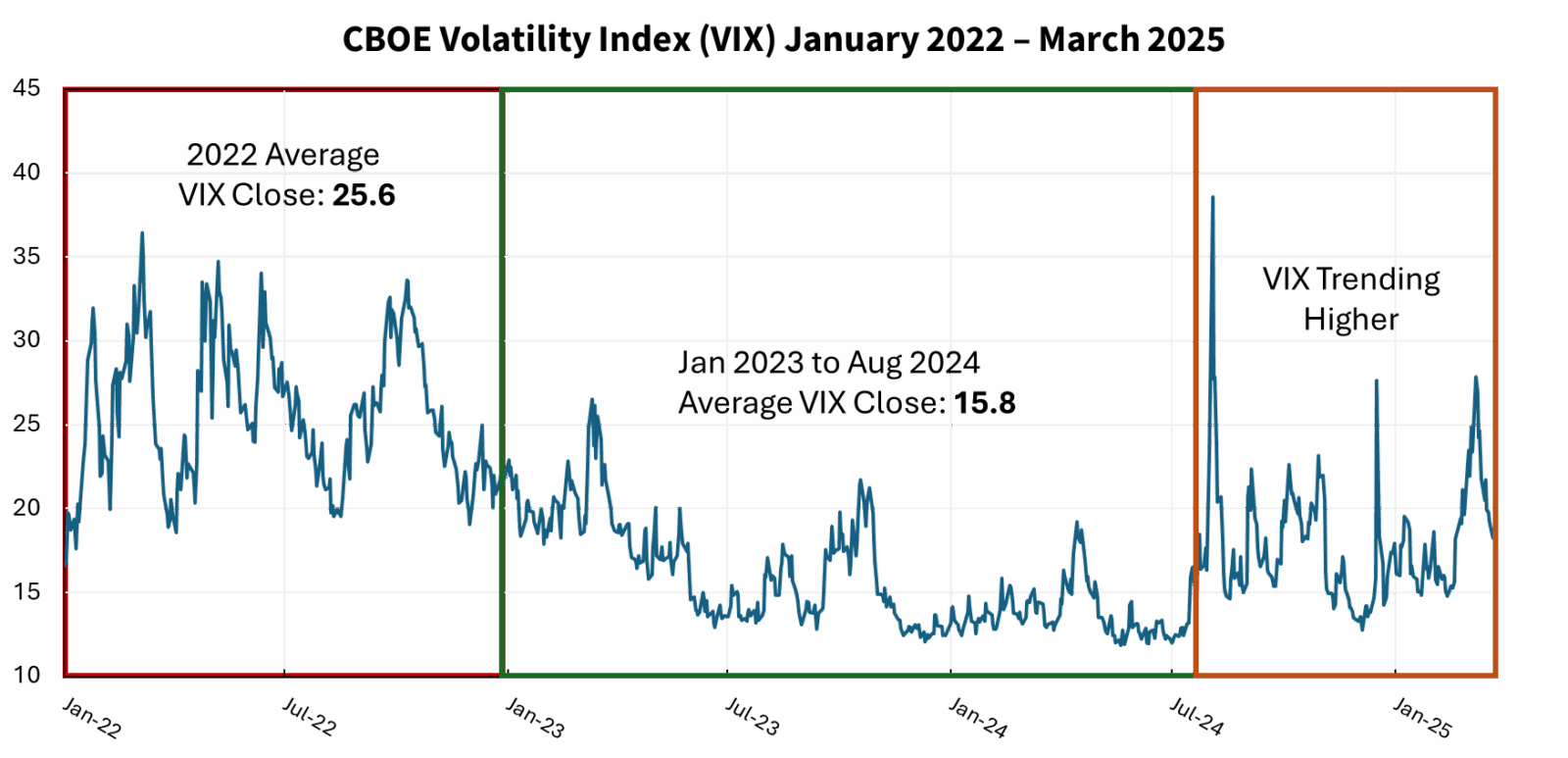 Equity market volatility ebbs and flows, and it is common for investors to experience the emotional highs and lows that come with it. However, the muted volatility experienced throughout most of 2023 and 2024 was far from normal, providing investors with nearly endless amounts of returns and pushing equity market valuations to historically expensive levels. These years were so good for investors that most quickly forgot that the challenging market of 2022, headlined by rising inflation and credit concerns, ever existed and buried the thought of negative returns in 2025. While volatility was down in these years, it never disappeared, and the quiet regime began to unwind in the back half of 2024. Since August of 2024, volatility has revived from its slumber and is climbing back to reclaim its title of being on the forefront of investor’s minds.