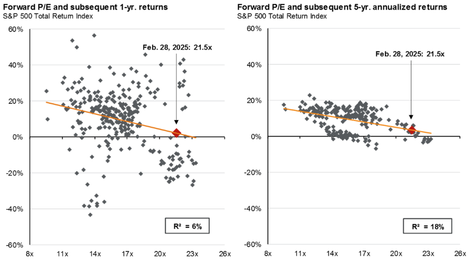 - Equity Valuations: As of February 28, 2025, US market valuations, represented by the S&P 500, were trading at roughly 21.5x forward earnings. While valuation alone may not prevent the index from accomplishing a three-peat of 2023/2024’s returns, they could make it increasingly difficult to do so. As equity valuations grow, so do expectations of future earnings growth, amplifying any negative news that may disrupt the market’s ability to achieve that future growth.