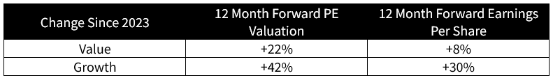 If we deconstruct the source of Value and Growth’s performance, we can see that Growth’s dominance has been fundamentally driven, meaning Growth dominance has been more than just AI hopes and dreams. As the table below shows, Growth has enjoyed far more valuation expansion than Value over the last two years, but Growth has also delivered more than 3x the earnings growth versus Value.