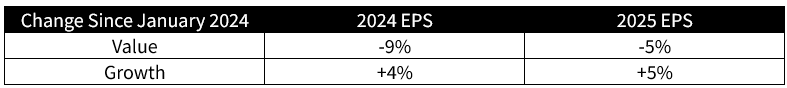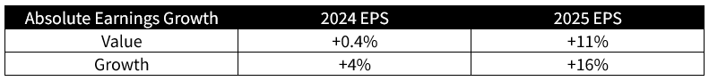 Looking to 2025, the market expects Growth earnings to outperform Value earnings once again, with +16% growth for Growth in 2025 vs. +11% for Value. As we mentioned above, this Value EPS estimate is a bigger “show me story,” given the persistence of negative earnings revisions that have plagued the Value index.
