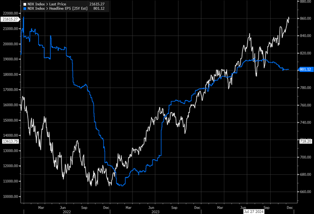 To see this another way, the chart below shows the Nasdaq 100’s price in white and its 2025 EPS estimates in blue. You can see clearly that falling EPS forecasts accompanied the fall in the Nasdaq in 2022, while the rise in the Nasdaq in 2023 and 2024 was supported by rising EPS forecasts. But 3 months ago, prices and earnings forecasts started to diverge, with EPS falling and prices surging.