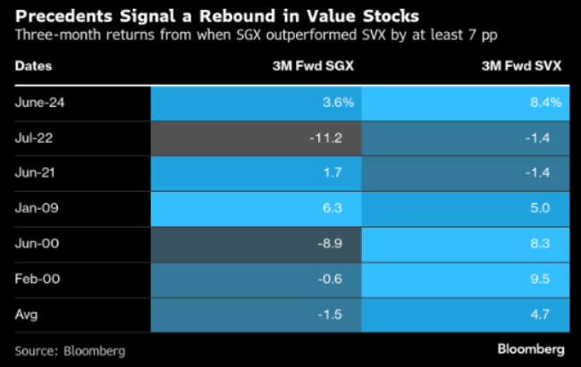An analysis from Bloomberg’s Markets Live Blog showed that post periods when Growth outperformed Value by 7% or more, as the Growth index has recently, Value tended to have a snapback period of outperformance. The table below shows how there have only been six observations since 1995 of this degree of Growth over Value dominance, with the average returns post these periods pointing to better Value returns, even if just for 3 months.