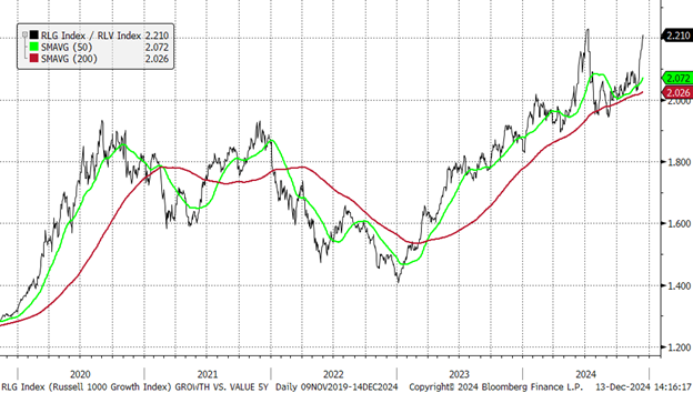Note: All references to Value and Growth are to the Russell 1000 Value and Growth indices, using Bloomberg data as of 12-13-24 unless otherwise noted.