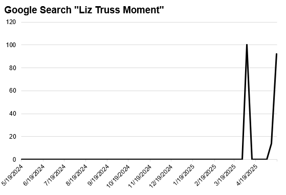 • Broad concerns about fiscal sustainability are likely putting upward pressure on global bond term premium, which is the extra compensation investors demand to lend for longer periods of time (see below for the chart of Google searches for “Liz Truss Moment” spiking, proving that the legacy of her budget deficit “yip” from 2022 has more staying power than a head of lettuce).