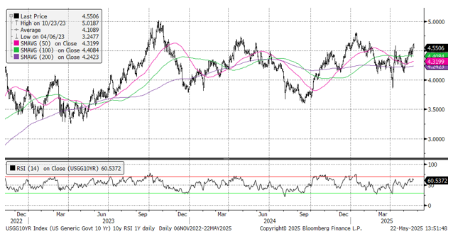 Given the moves to new cycle highs for 30-year bonds, we can’t rule out a breakout above 5% on the 10-year (this would likely require a reacceleration in growth and/or inflation, plus a fiscal deficit bonanza). This would be a thoroughly jarring development for global markets, making a close monitoring of the 10-year yield at these various resistance levels an imperative.